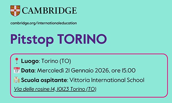 Cambridge International Education è lieta di presentare "Pit Stop - Piemonte 2026", un evento esclusivo dedicato ai docenti di inglese di ogni ordine e grado e a tutti coloro che desiderano arricchire la propria esperienza formativa all’interno della comunità Cambridge International Education.